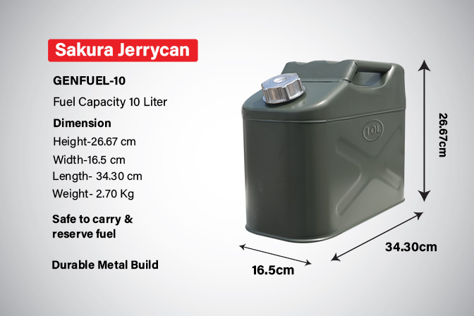 Sakura Metal Fuel Jerry Can is a storage container typically made of tough and durable metal, such as steel. These Jerry Cans are designed for the safe and secure storage and transport of various types fuels such as Gasoline, Diesel or Kerosene. Mostly preferable for Gasoline.